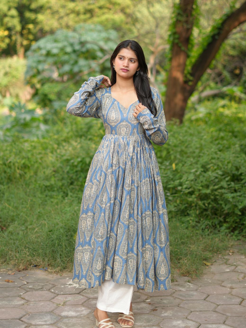 The Blue Paisley Flared Kameez brings together comfort and elegance with its flowy silhouette and classic print. A versatile piece to keep your ethnic wardrobe effortlessly stylish.