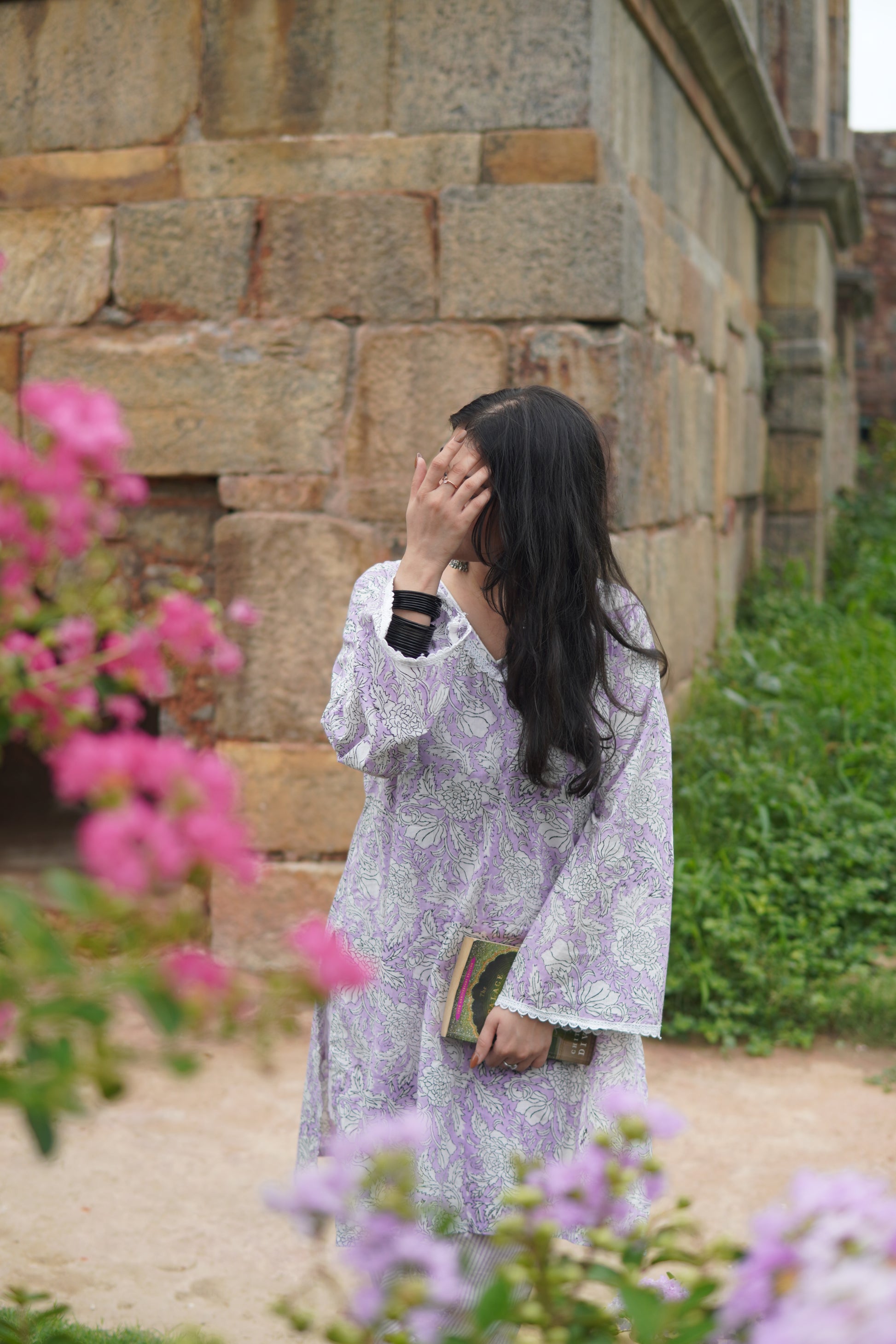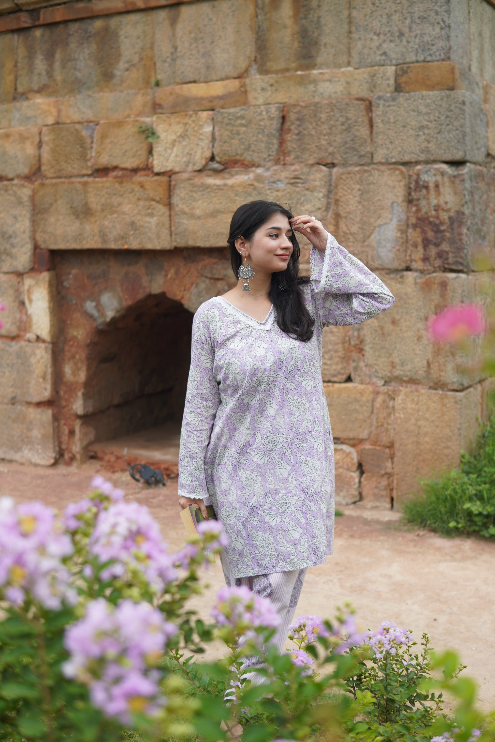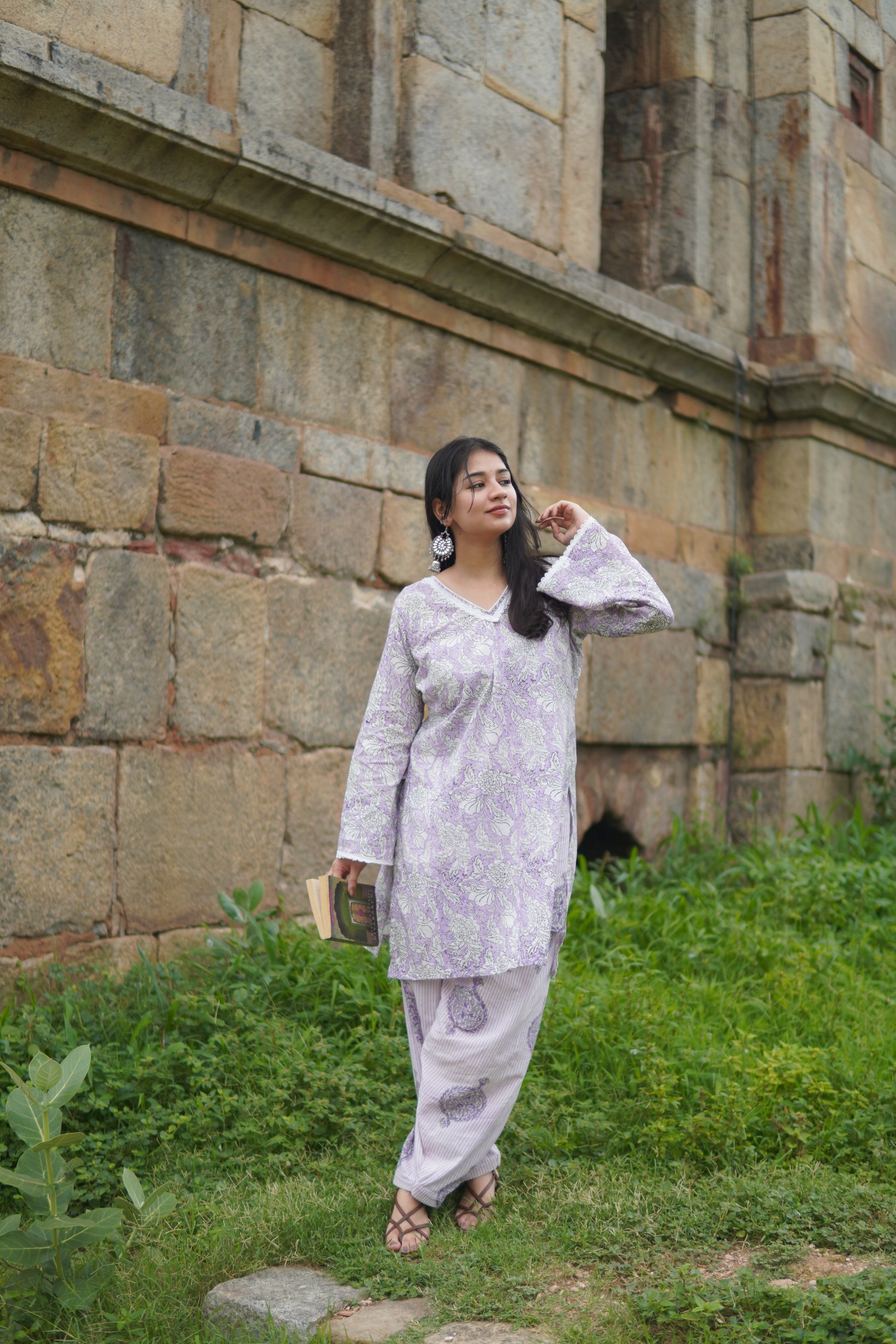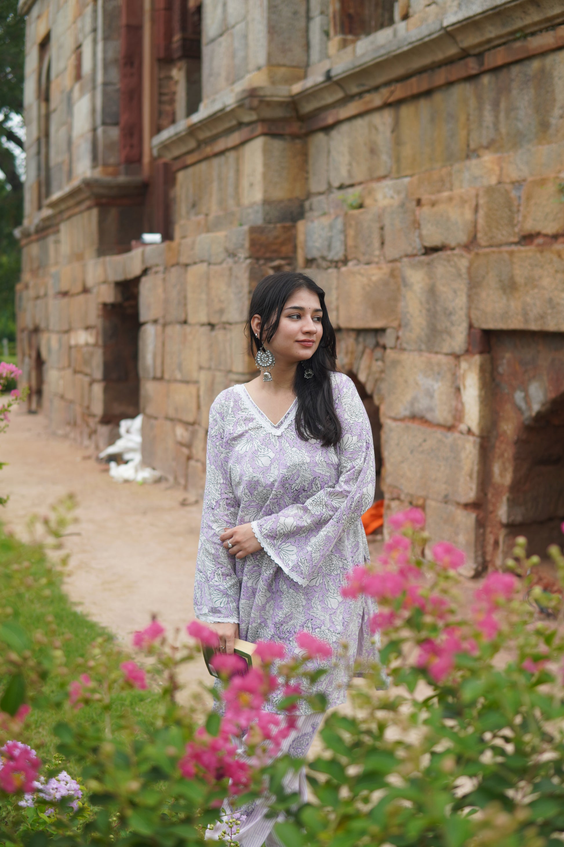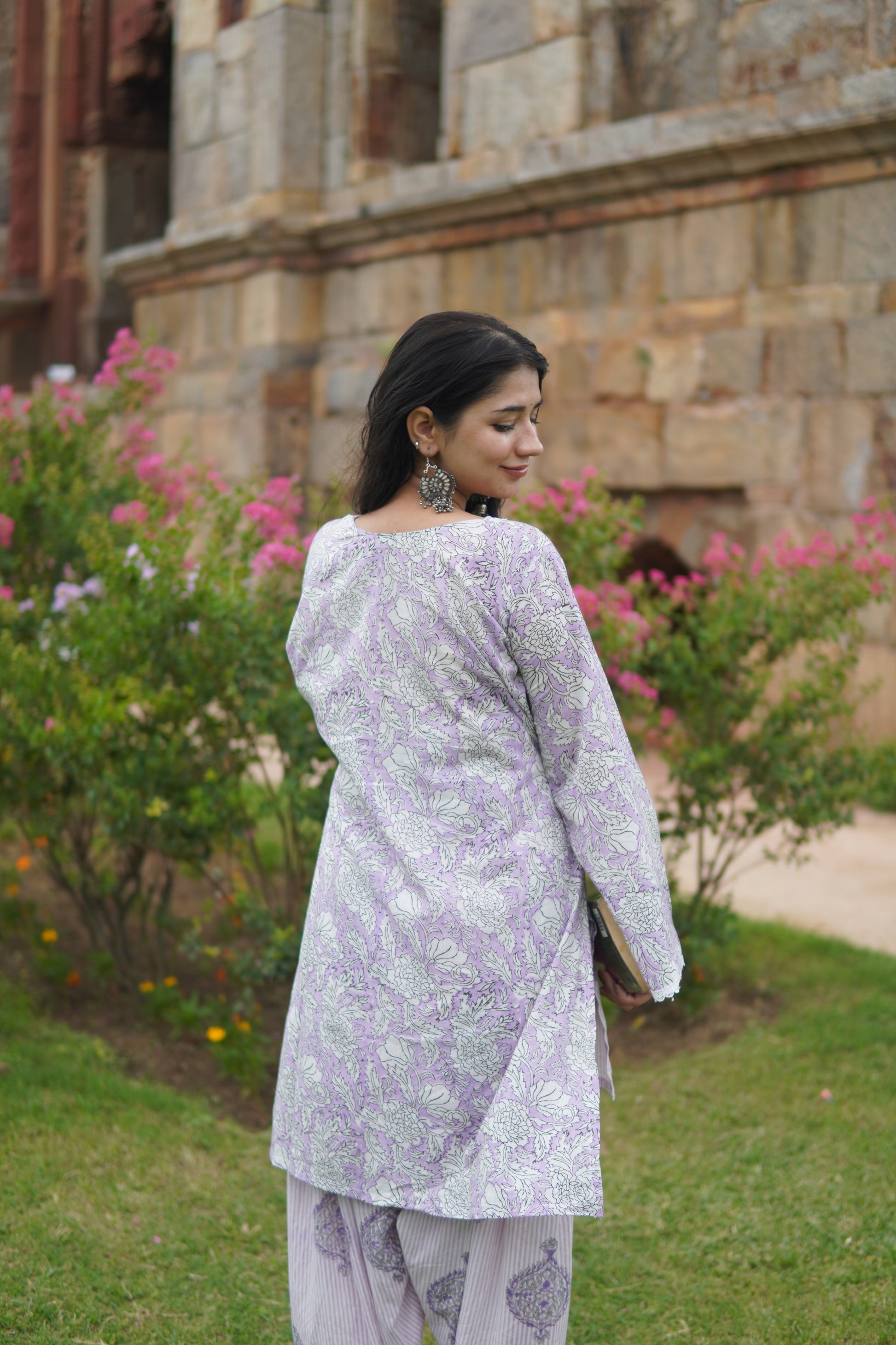 Gracefully elegant and refreshingly breezy, this Nawabi comfort handblock set brings together traditional artistry and everyday comfort. Crafted in soft, breathable cotton, the kurti features handblock-printed floral motifs in soothing shades of lavender and ivory. The intricate block print work celebrates heritage craftsmanship, making each piece subtly unique.