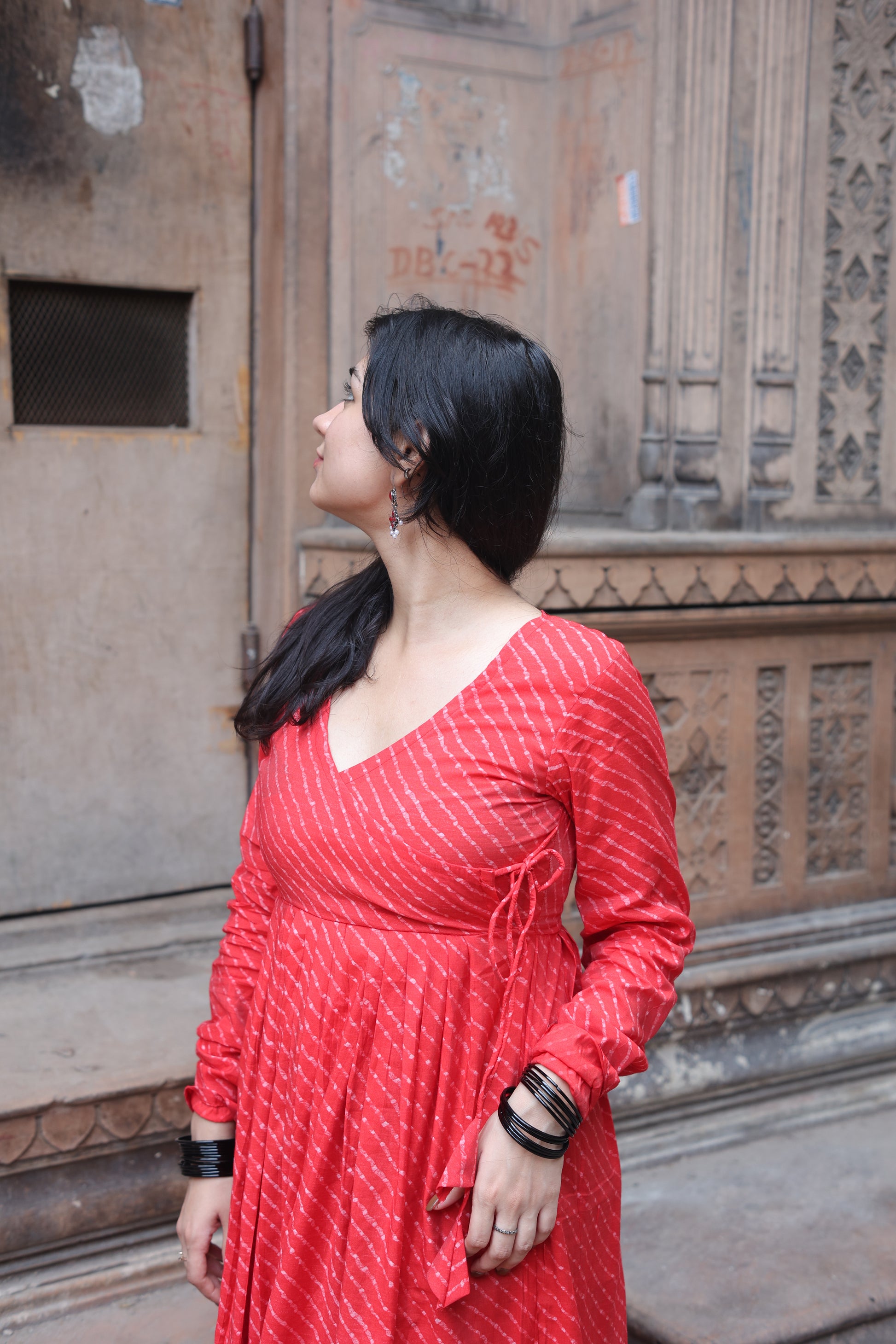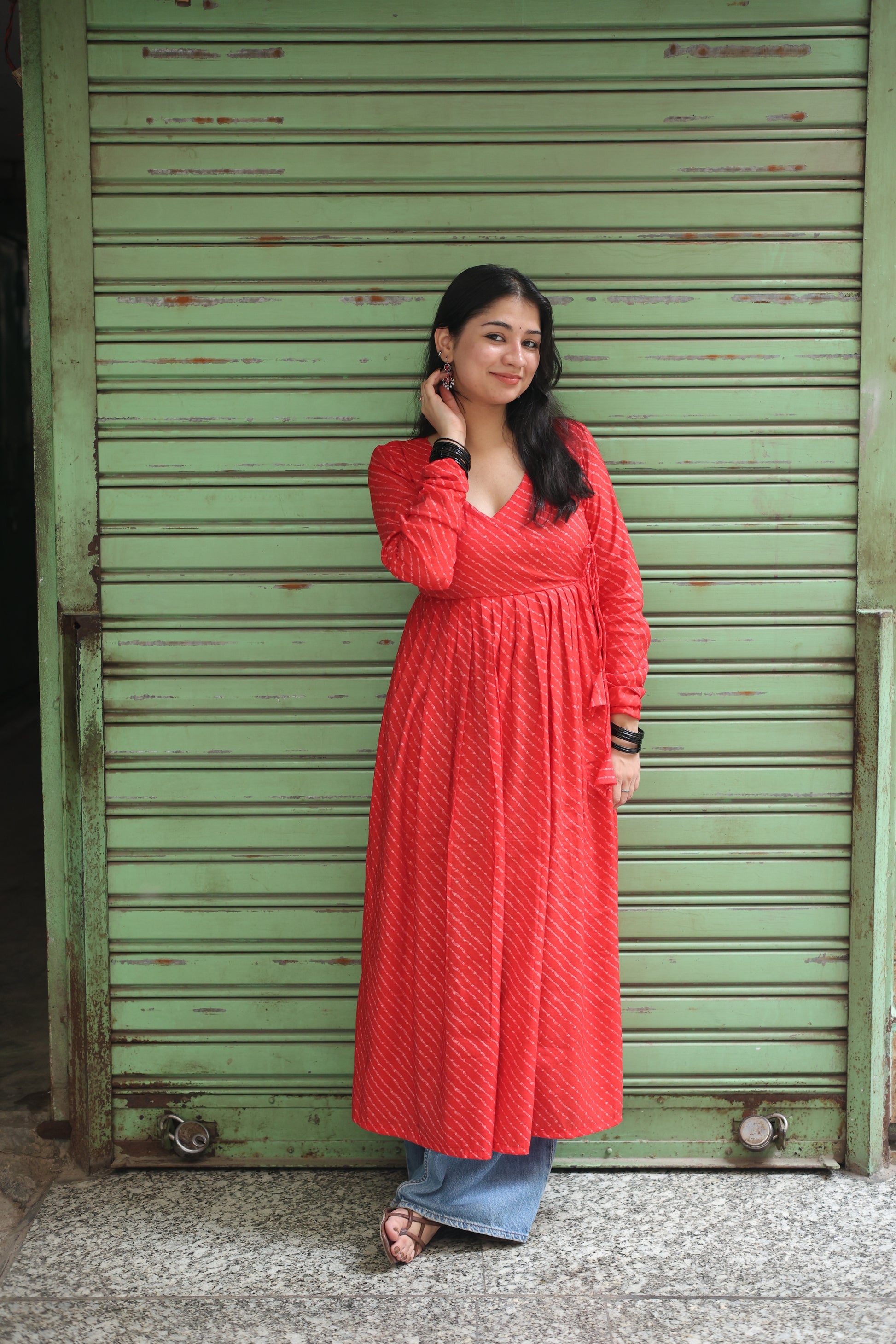 Drape yourself in the timeless elegance of Rajwadi leheriya kameez — a 47-inch pure muslin kurta crafted in the classic Angrakha style. Adorned with traditional hand-dyed Leheriya in a bold red hue, this piece brings together the fluid grace of Rajasthan with the softness of premium muslin. The wrap-style tie-up design flatters all body types while celebrating desi roots with a modern edge.
