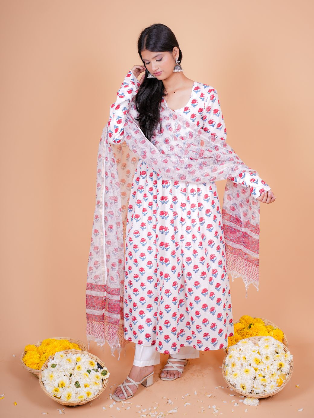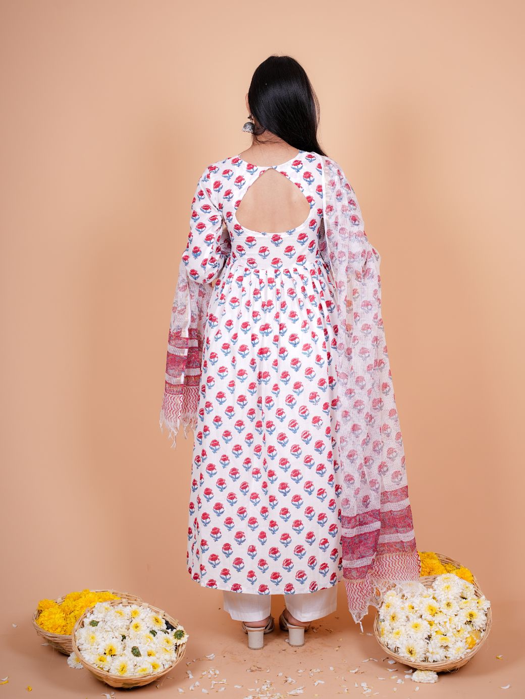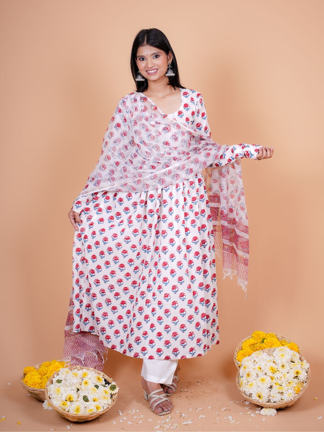 Crafted from breathable cotton, this set features a white base adorned with delicate floral prints in shades of rose pink and soft blue, giving it a fresh and feminine look. The Anarkali kurta flows beautifully, paired with a matching printed dupatta and coordinated bottoms for a complete traditional look.