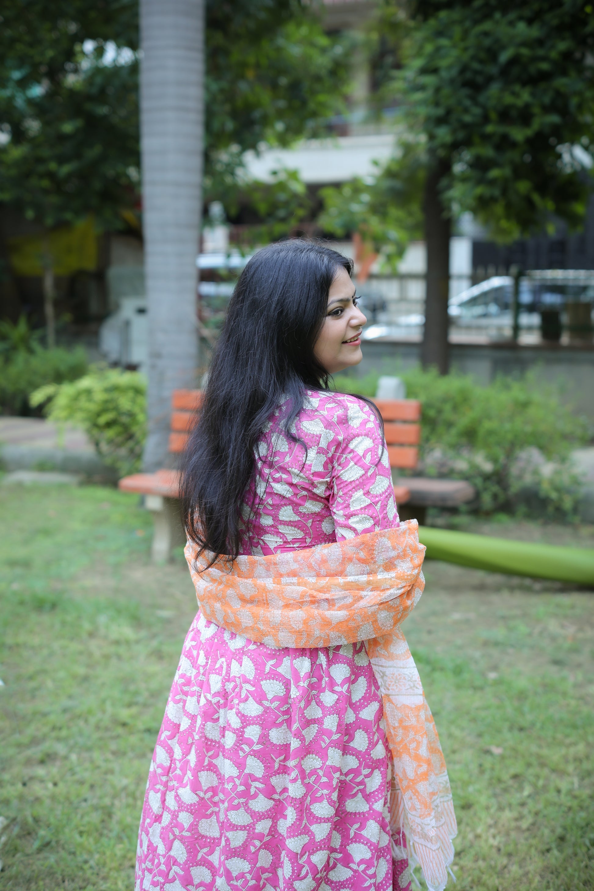 A romantic blend of comfort and tradition, this kesar gulabi three piece set sweetheart-neck Anarkali set in blush-pink cotton blooms with saffron and white floral block prints. Full sleeves and a graceful flare add elegance, paired with solid cotton pants for ease. The look is elevated with a 2.5-meter saffron-orange Kota Doriya dupatta finished with tassels for a light, festive touch. Perfect for celebrations or day events.