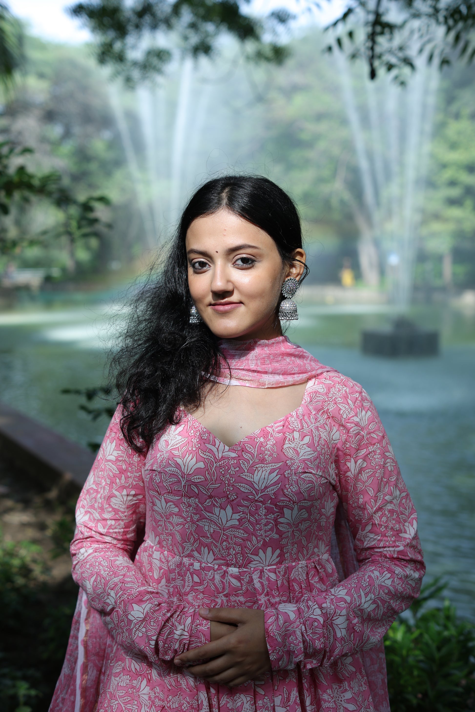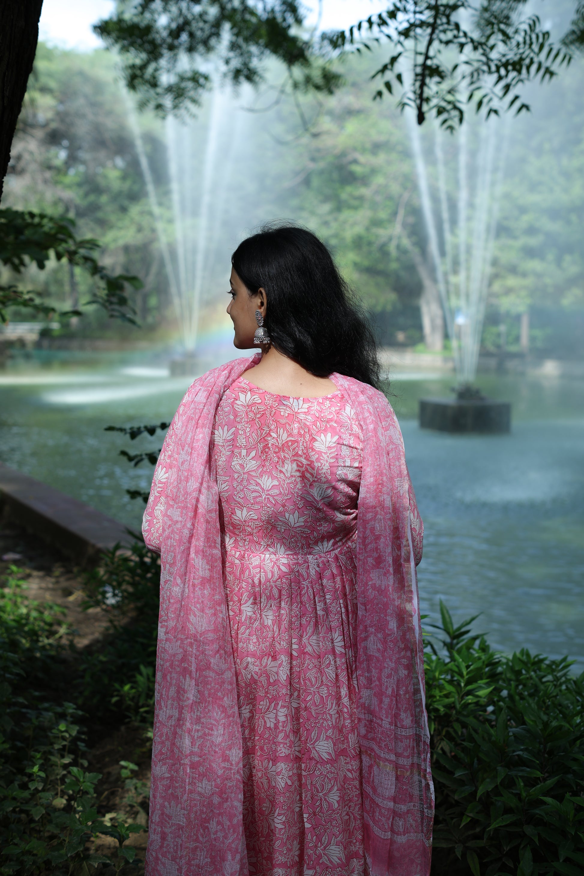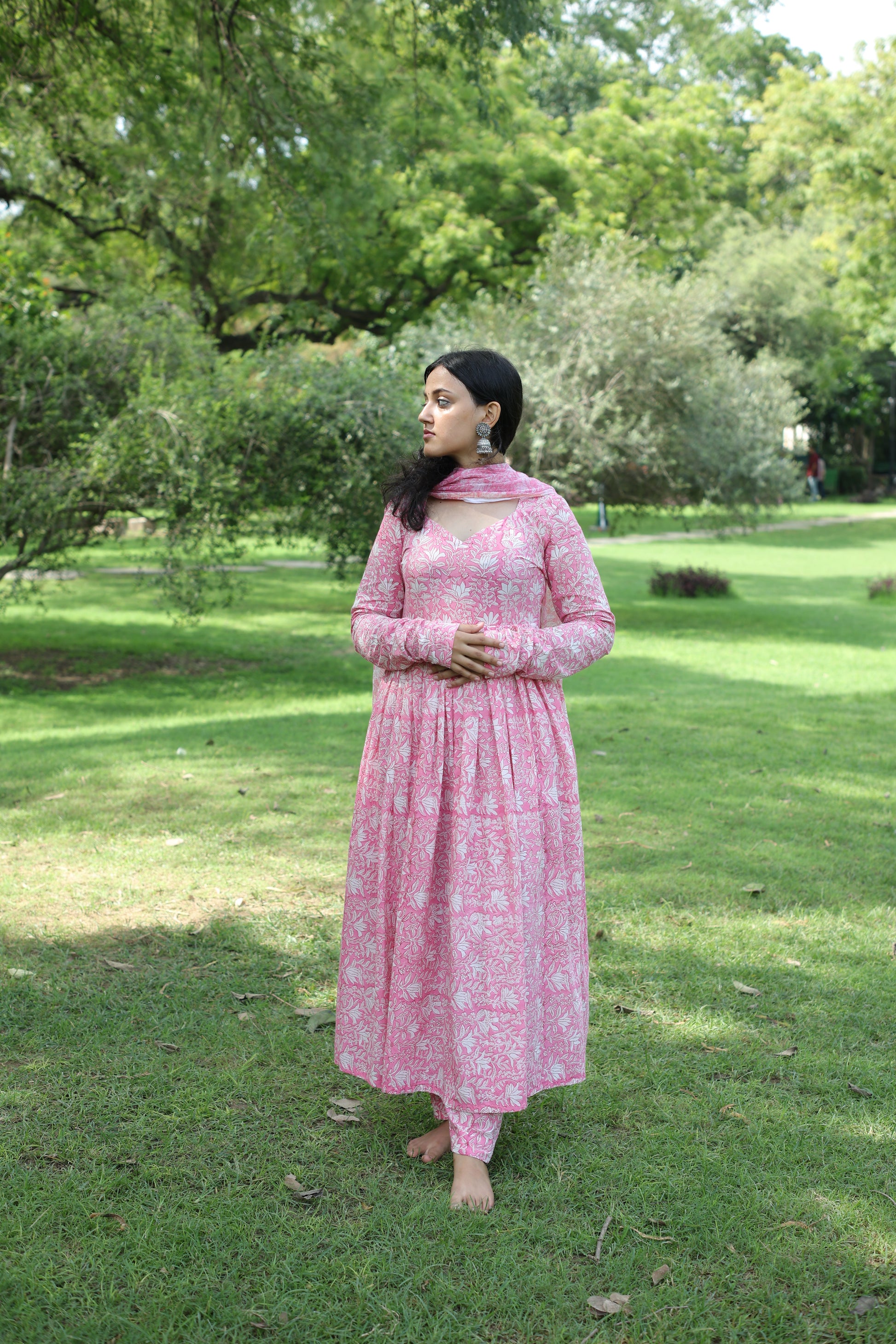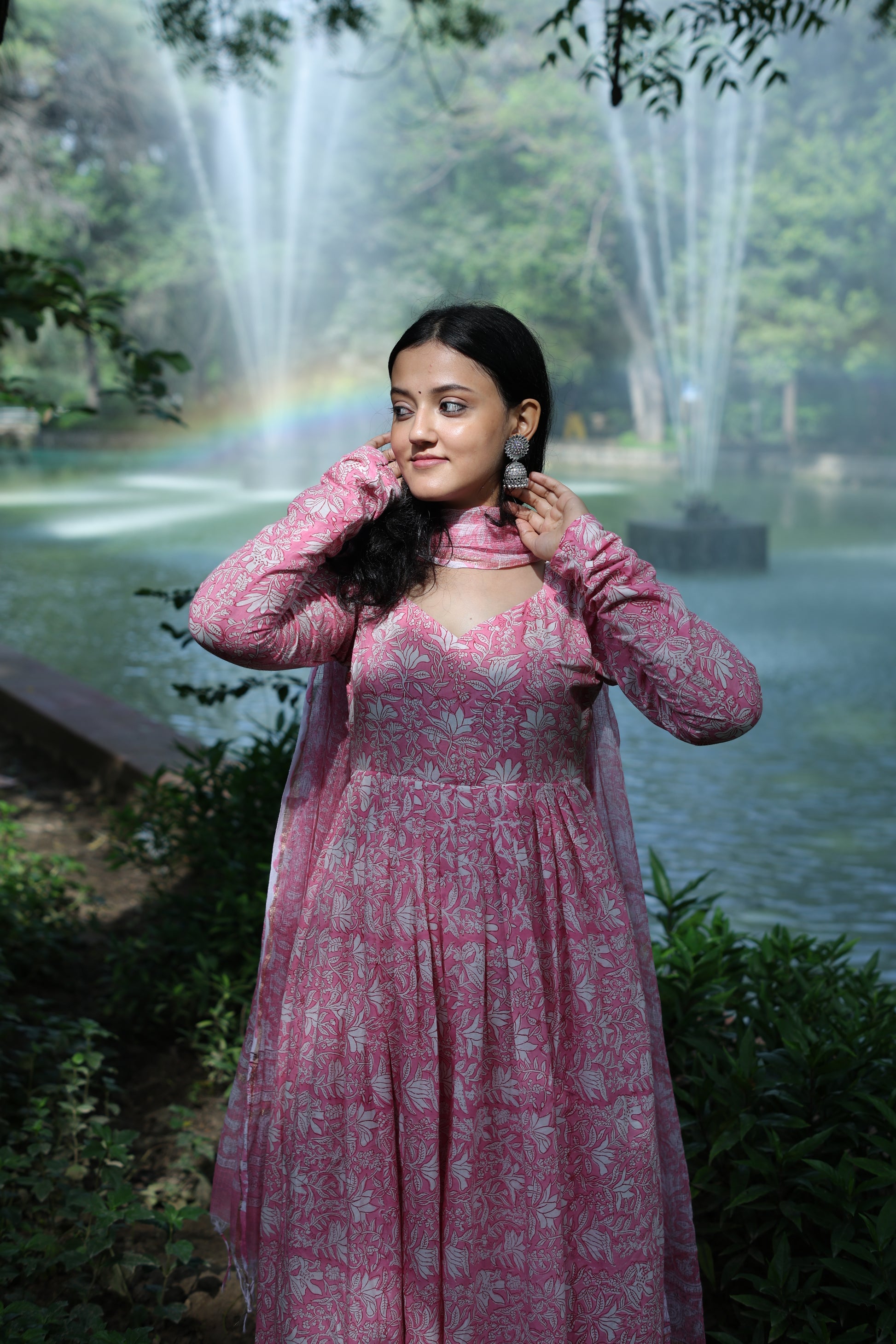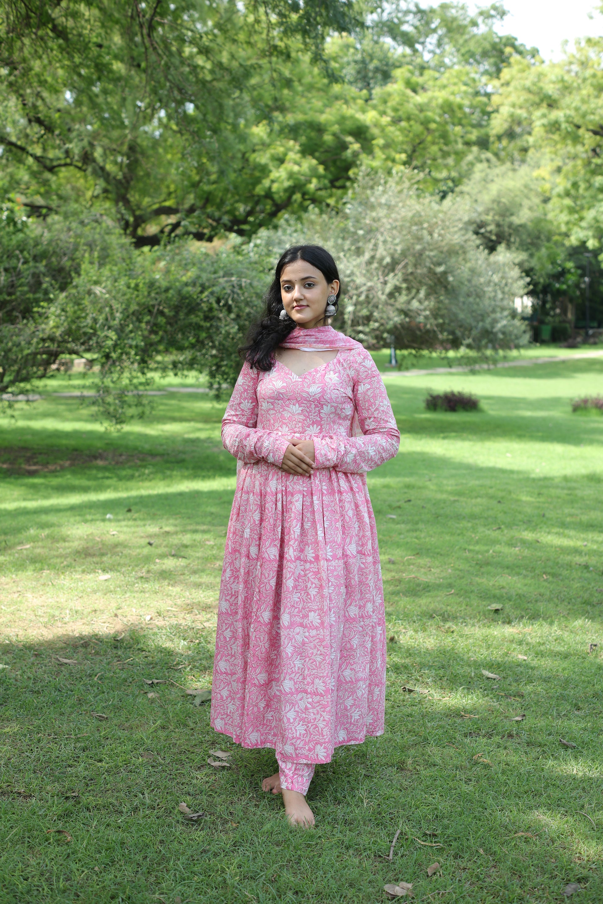 Gracefully elegant and thoughtfully handcrafted, the roohani Anarkali Set is a timeless blend of tradition and charm. Made from soft, breathable cotton, this pink Anarkali features intricate white floral handblock prints, full-length sleeves, and a flattering sweetheart neckline. The beautifully pleated silhouette adds flow and grace to every movement.