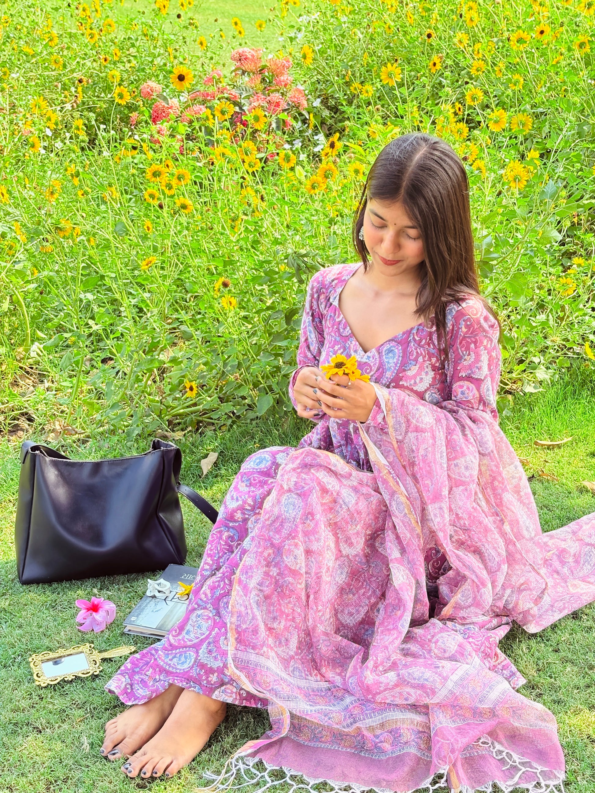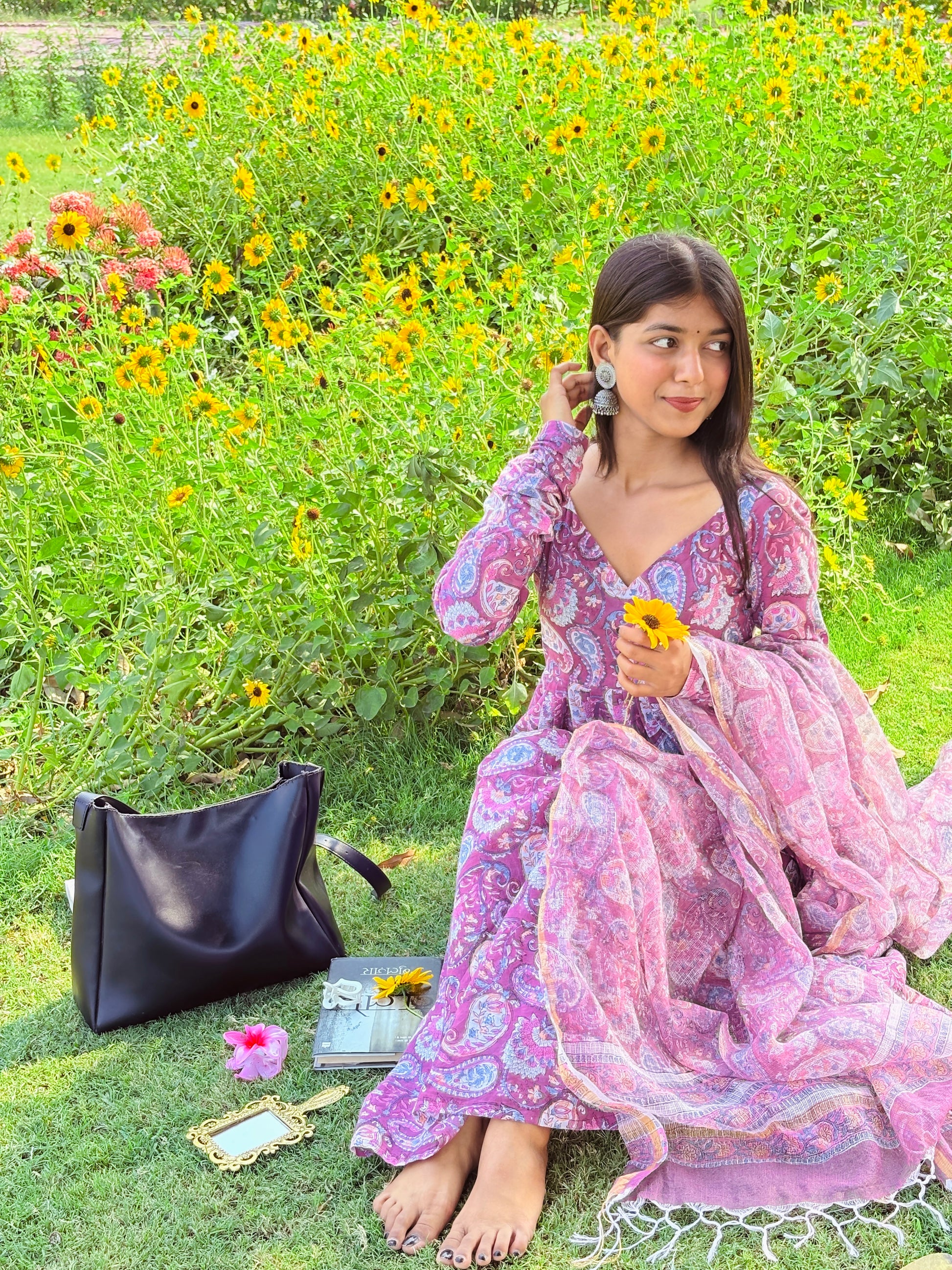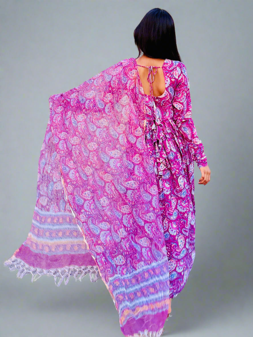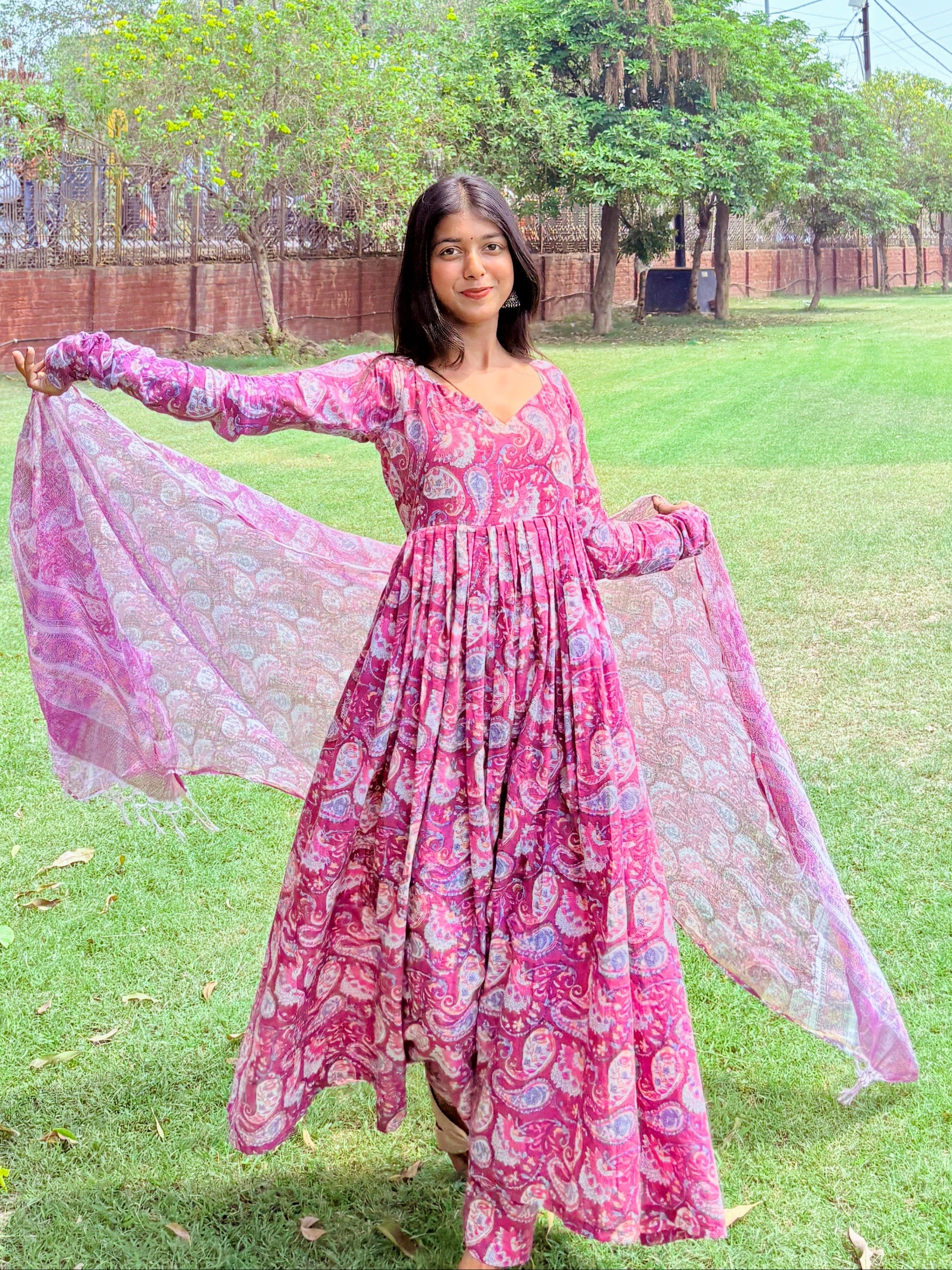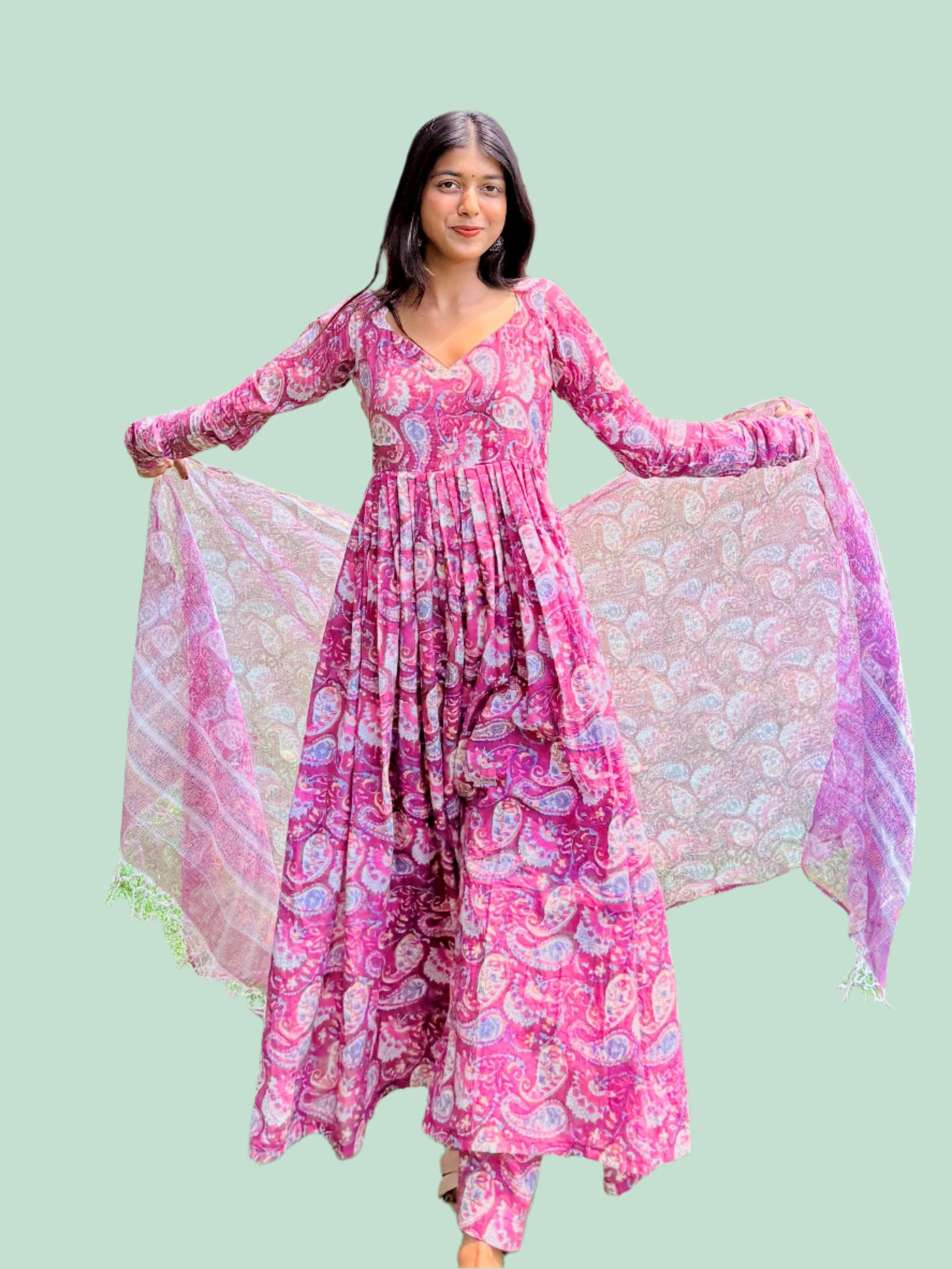 Graceful and elegant, the ZIVA Set features a three-piece anarkali design that embodies comfort and tradition. Made from soft cotton handblock fabric, it includes a stylish Kota Doria handblock dupatta for an added touch of sophistication.