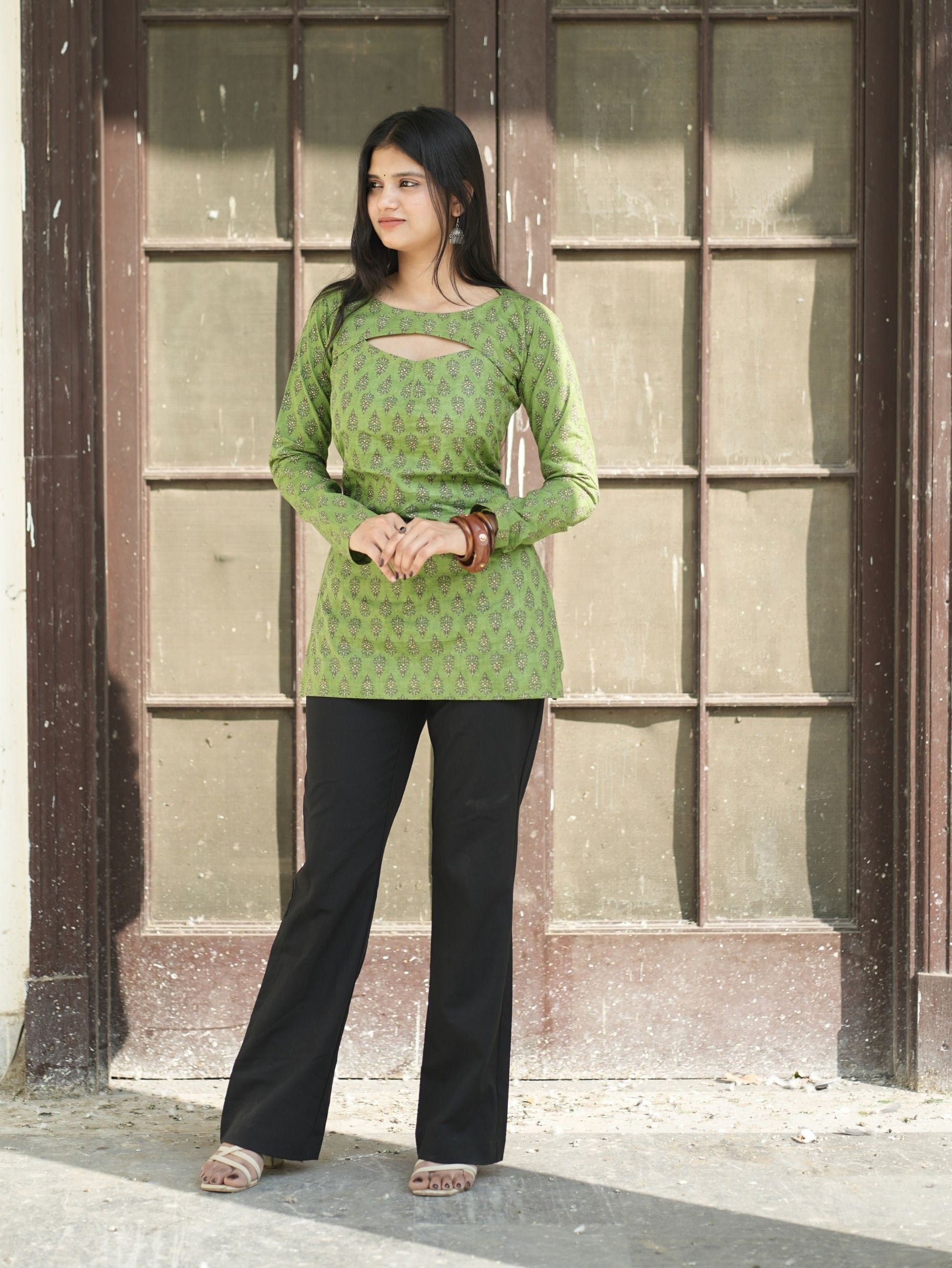 The Sifaarish Convertible Short Kurti Set is a versatile and contemporary ethnic outfit designed for women who love styling flexibility. Crafted in breathable cotton fabric, this green short kurti set features a unique convertible neckline with a detachable panel, allowing you to create multiple looks from a single outfit.