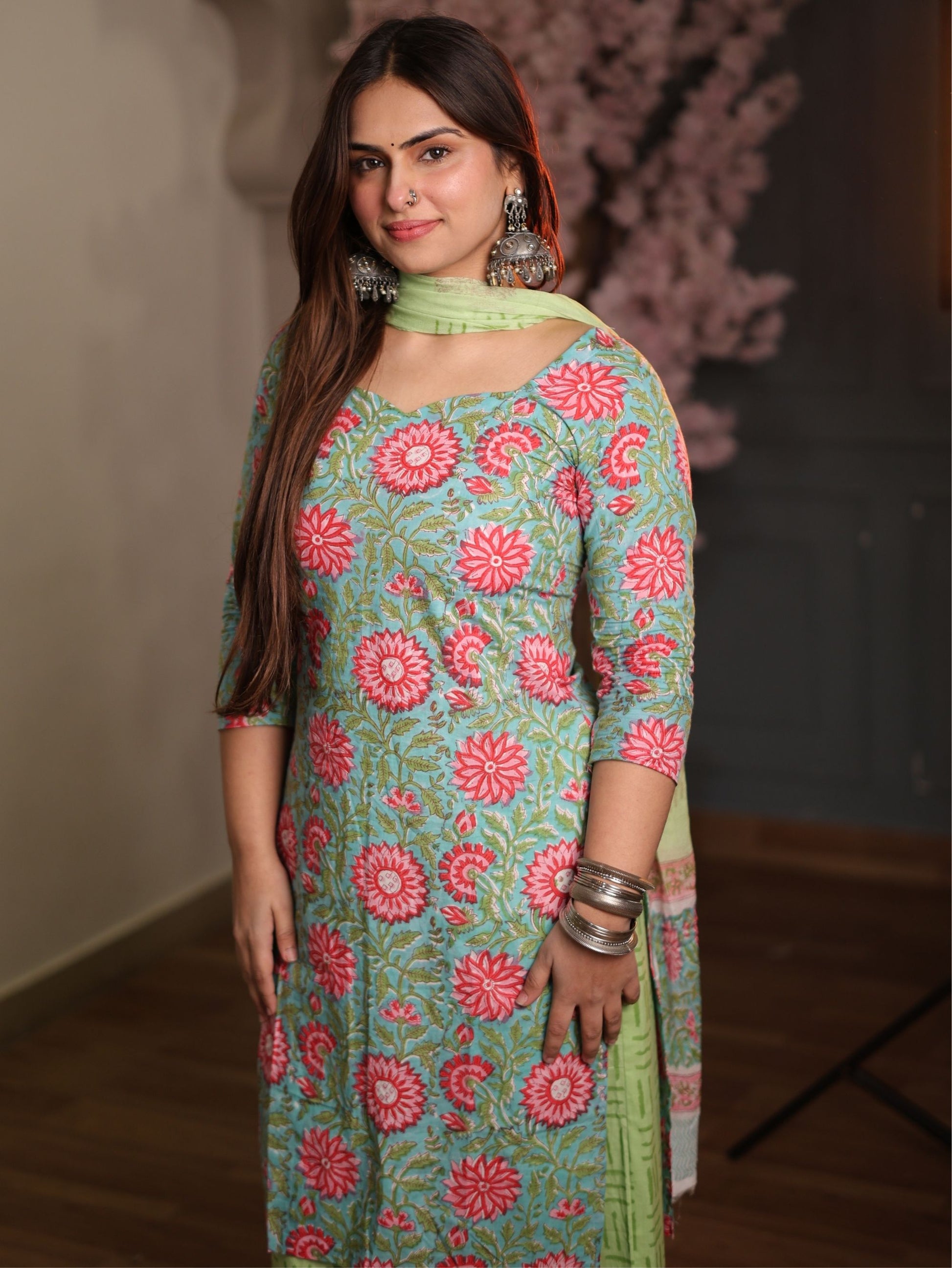 The highlight of this outfit is the balanced contrast of colours: the refreshing green base with pink floral tones gives it a lively ethnic vibe while still feeling light, modern, and wearable. The chiffon dupatta adds movement and completes the look beautifully, making this an easy “ready to wear” traditional set for every wardrobe.