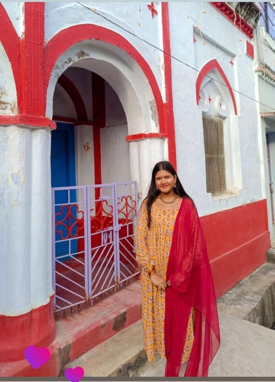The Kesariya Ghera Kameez is a celebration of Indian block-print heritage, rendered in a warm mustard hue with classic floral bootis in soft maroon and olive tones. Made in breathable cotton fabric, it features a clean round neckline and gracefully gathered full sleeves, creating a silhouette that’s both easygoing and elegant.