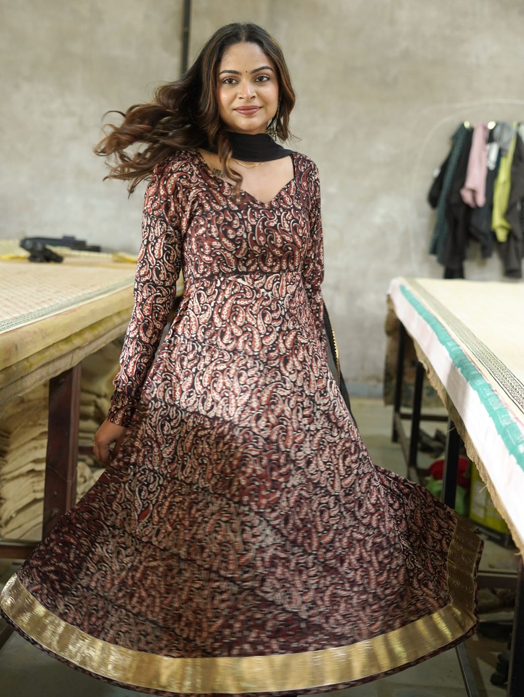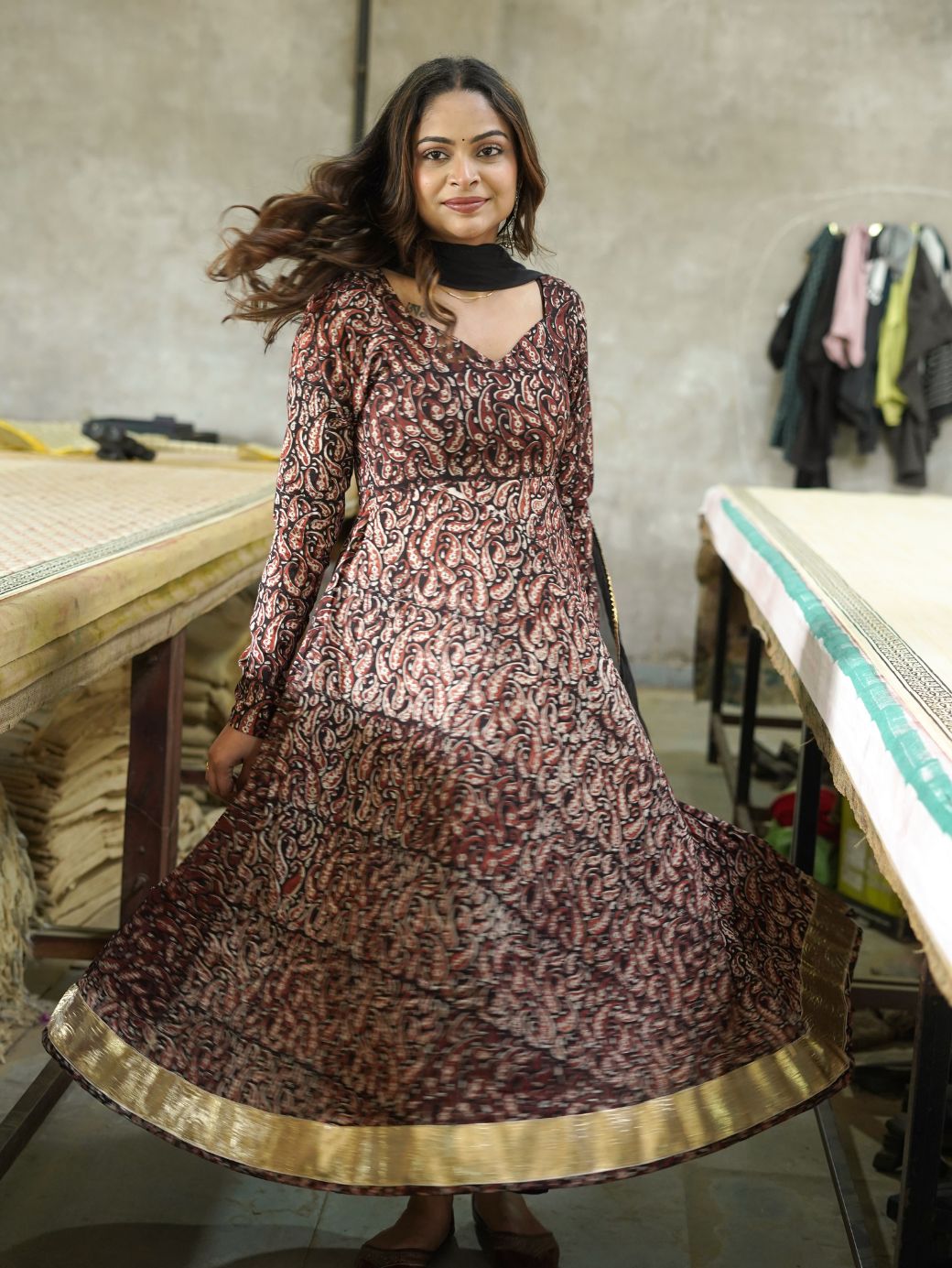 The Anarkali kurta features a stunning flare with intricate paisley motifs and a golden border that enhances its festive appeal. Complemented with comfortable cotton pants and a lightweight chiffon dupatta measuring 2.5 meters, this three-piece set blends elegance with ease.