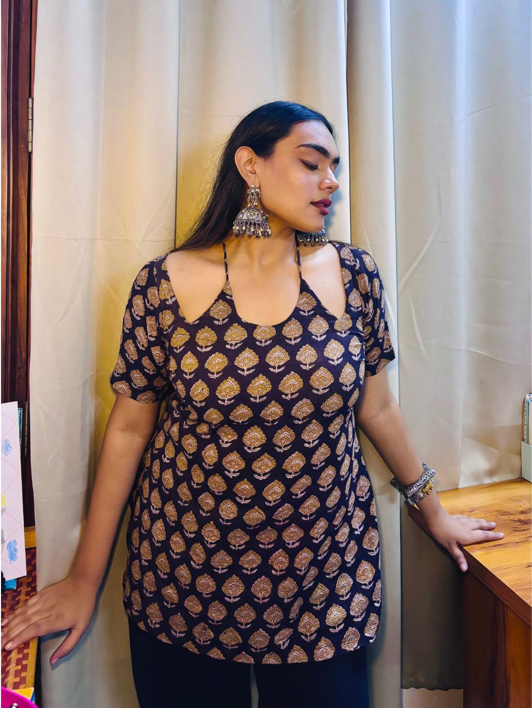 Effortlessly chic and rooted in tradition, the Nira Ethnic Halter Kurti blends modern elegance with timeless Indian craftsmanship. Made from soft, breathable cotton, this kurti features a unique halter neckline with intricate block prints in earthy tones, making it a standout piece for casual outings or festive gatherings. Its relaxed fit ensures comfort while maintaining a flattering silhouette. Pair it with straight pants, jeans, or ethnic skirts for a versatile look that transitions seamlessly from day to evening.