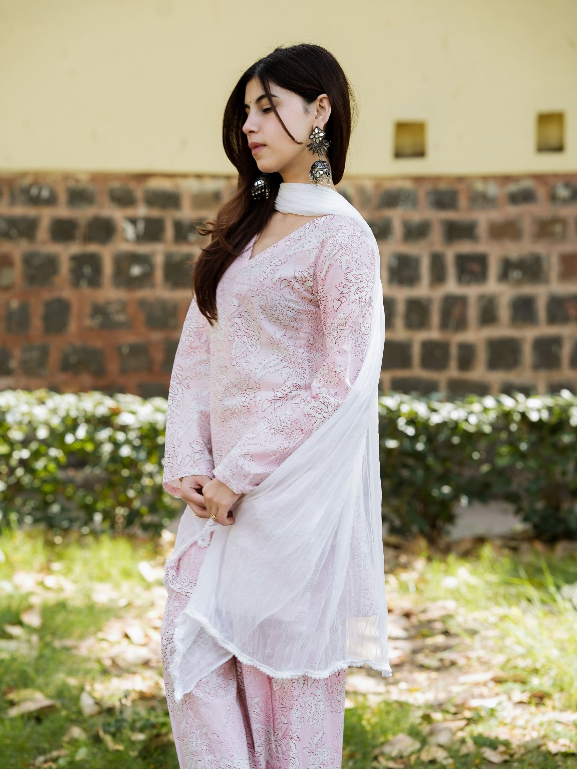 The set is completed with a lightweight white chiffon dupatta that adds softness and flow to the overall look. Perfect for festive gatherings, family functions, brunch outings, and summer ethnic wear, this outfit blends traditional silhouettes with modern minimal style.
