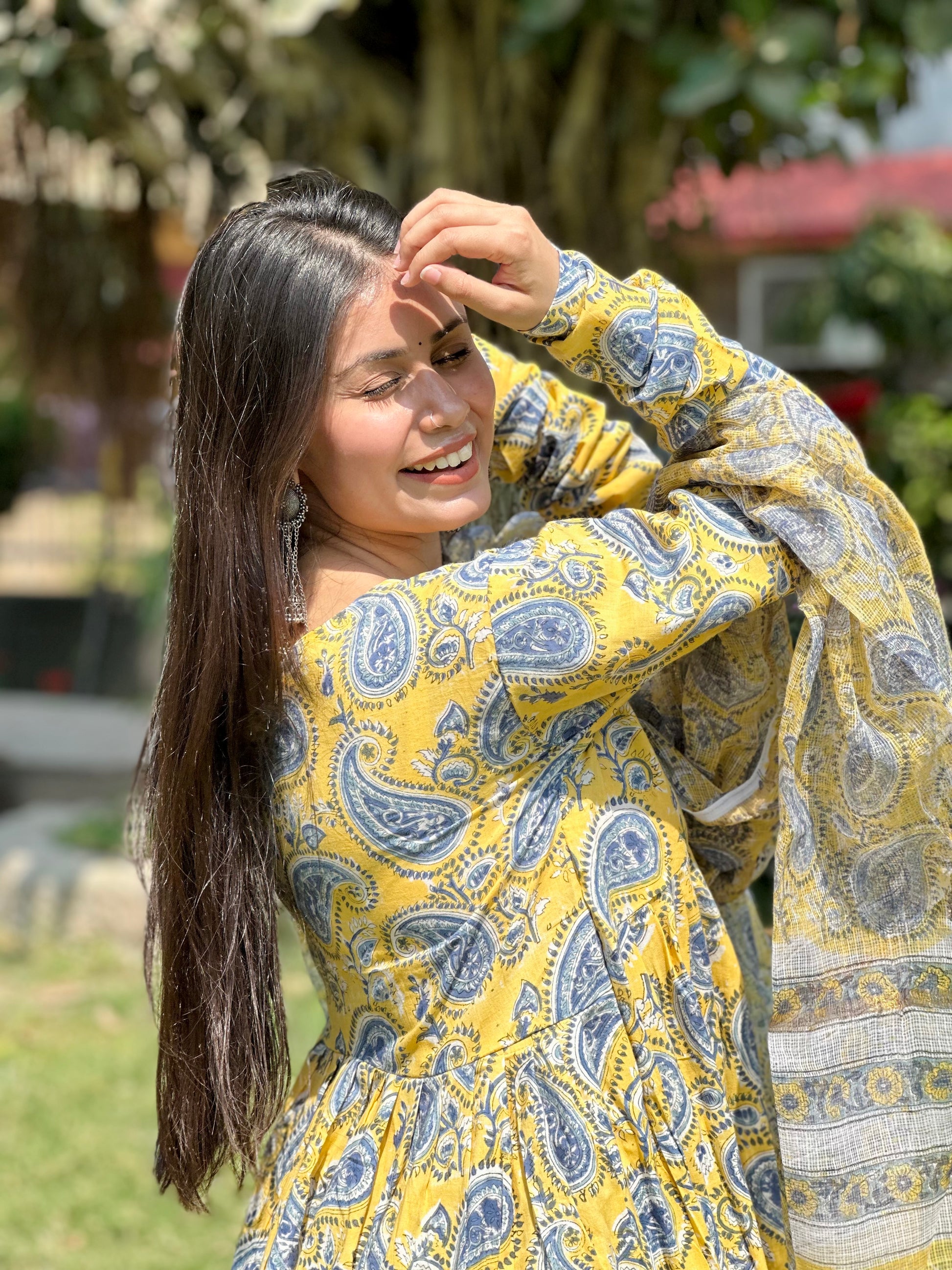 Brighten up your wardrobe with the Yellow Paisley Three Piece Anarkali Set by Krutico. Crafted from soft, breathable cotton handblock fabric, the kurta and pants feature intricate paisley patterns that exude traditional charm. The look is completed with a lightweight, 2.5-meter handblock printed Kota Doria dupatta, adding a breezy elegance to the ensemble.